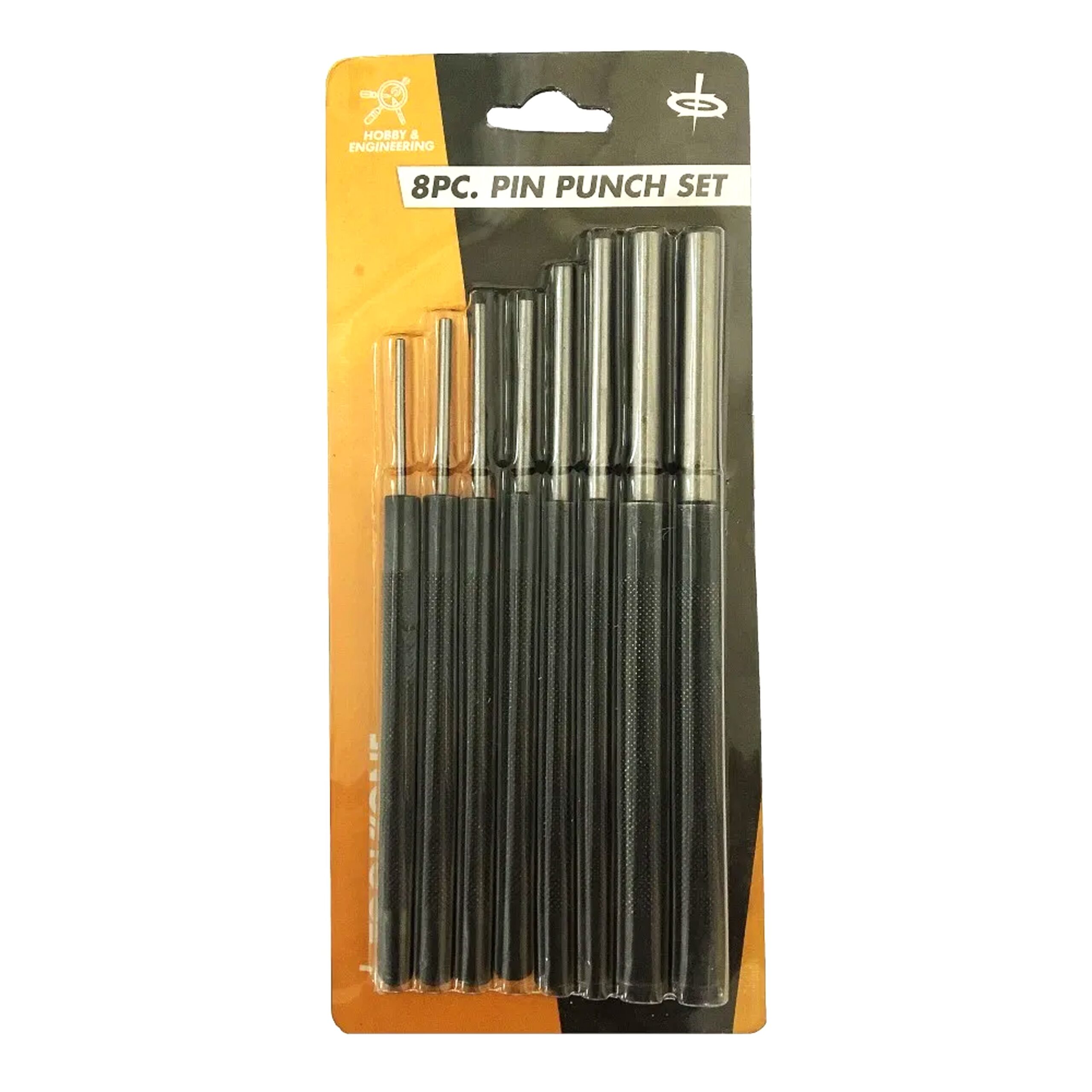 This 8-piece pin punch set includes a range of sizes suitable for pin removal and alignment tasks. The overall lengths of the punches vary from 153 mm to 179 mm.