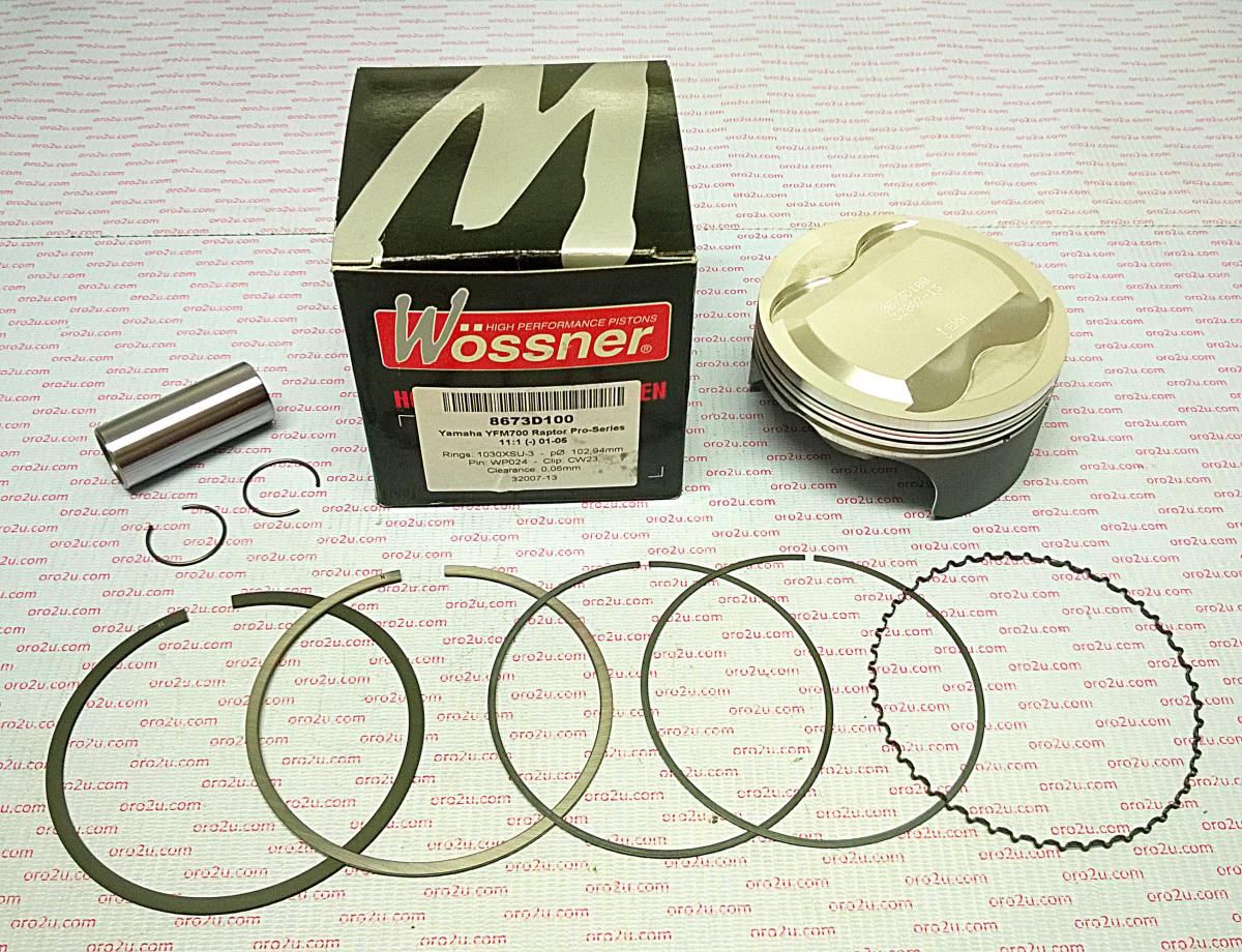 The Wossner 8673D100 forged piston kit features a 103.00mm bore and is designed for high-compression applications in Yamaha YFM700 Raptor ATVs from 2006 to 2016. Precision-engineered in Germany, this piston enhances strength, heat dissipation, and durability, while its elliptical shape ensures even load distribution and resistance to collapse under thermal expansion.