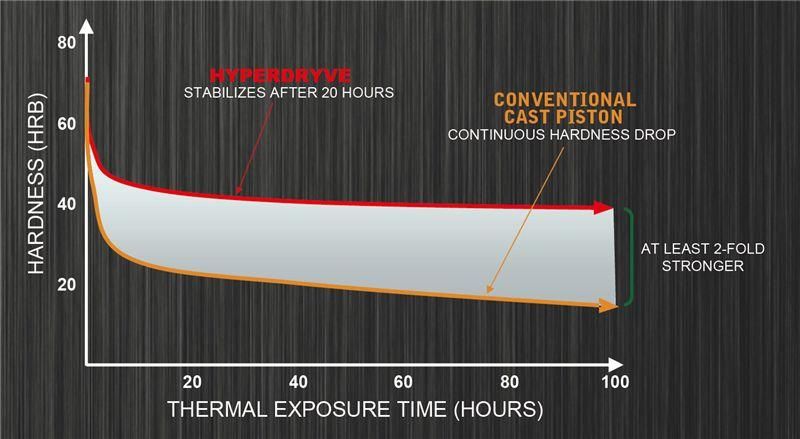 age hypereutectic aluminum alloy developed by NASA. Engineered to maintain its high tensile strength up to 700 F(370C), 50% higher than a conventional cast piston, this gives HYPERDRYVE the strength to perform under operating conditions normally reserved for forged pistons.
