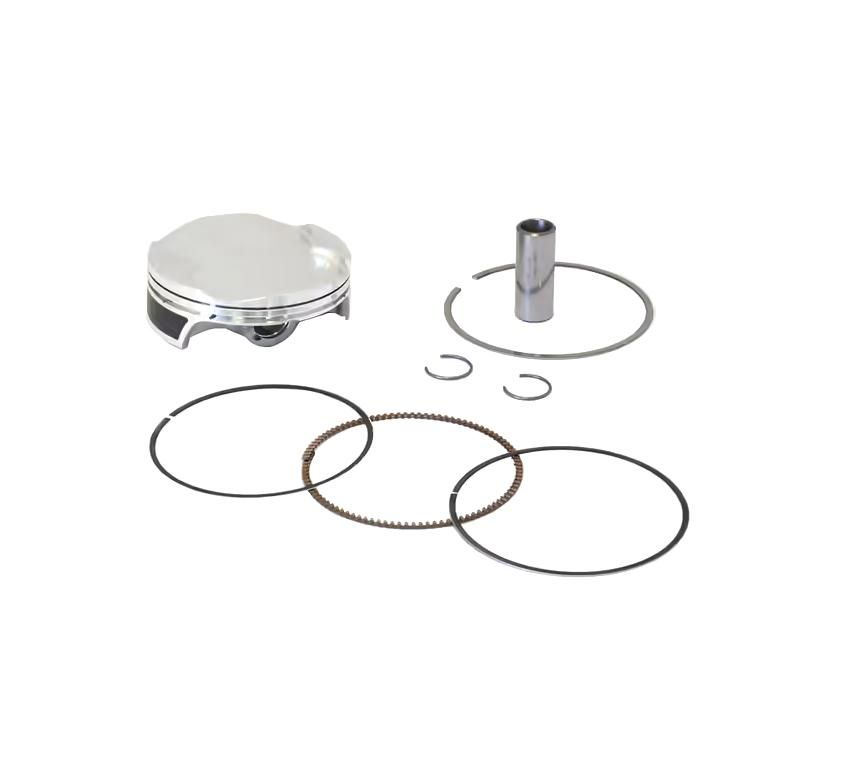 This piston kit contains the piston, the pin, the circlips, and the piston rings. All components are replaceable and interchangeable in case of need.