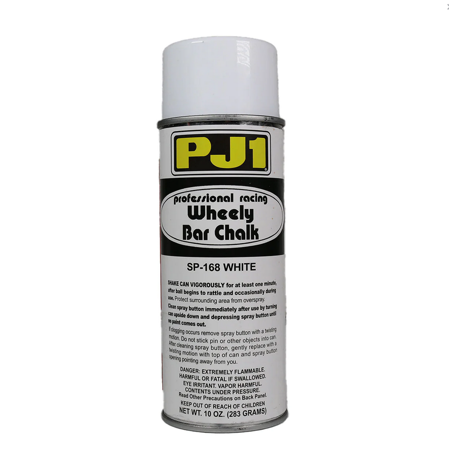 PJ1 Wheely Bar Chalk has been developed to replace messy and hard to clean shoe polish, commonly used on Wheely bar wheels in drag racing. This unique, easy to clean aerosol coating is a must for any drag racer who runs Wheely bars. Effectively helps in determining chassis and clutch adjustments.