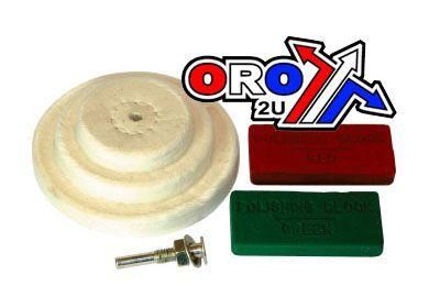 Kit contains 3 stitched buffing wheels (50, 75 and 100mm), red and green polishing compounds. 6mm (1/4”) mandrel attachment suitable for most power drills.
