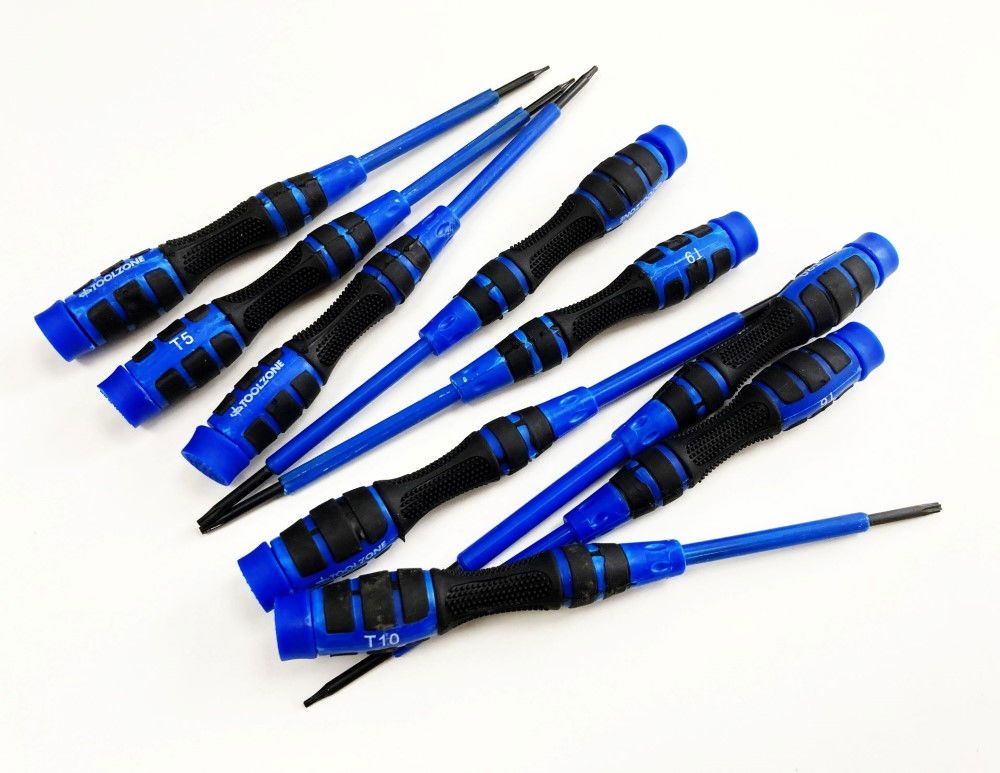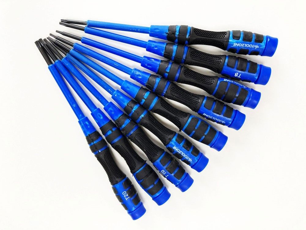 This 9-piece precision star screwdriver set includes sizes from T4 to T20. Each screwdriver features a magnetic tip, revolving top for easier handling, and a soft grip handle for comfort during use.