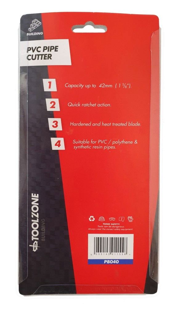 This PVC pipe cutter features a diecast aluminium body and a hardened, heat-treated blade. It is equipped with a quick release ratchet action, allowing it to cut pipes up to 42mm in diameter, including PVC, polyethylene, and synthetic resins.