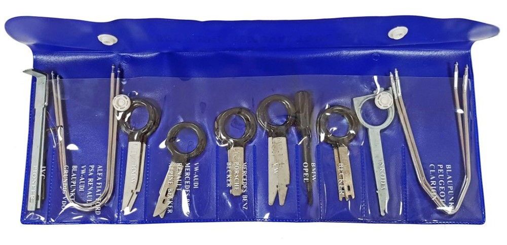 This 20 piece radio removal tool set is designed for the extraction of car stereos. The assortment is supplied in a plastic tool roll for organized storage.