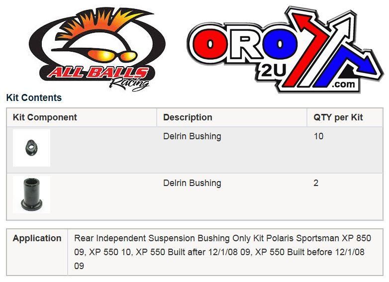 - Cost-effective kit containing all components needed to rebuild one side of an ATV rear suspension.