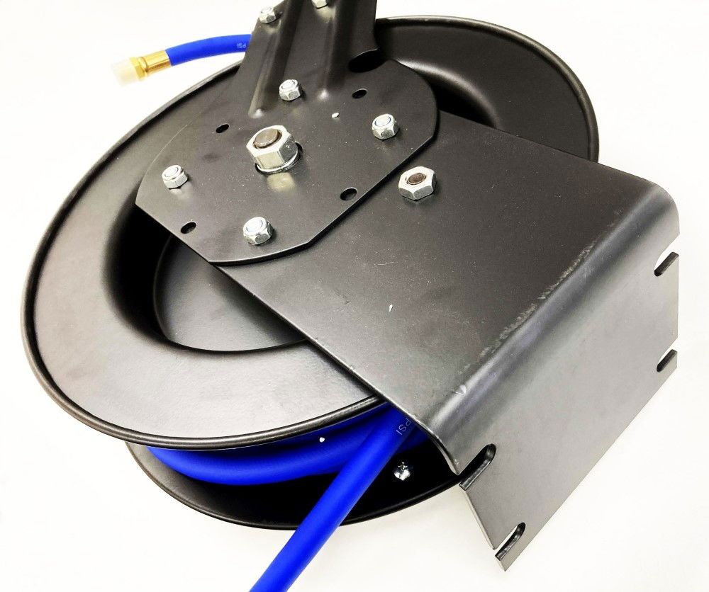 This 30ft retractable air hose features a 3/8” diameter and is constructed with heavy-duty steel for industrial and commercial applications. It is designed with a spring-powered auto rewind mechanism and can be mounted on a wall, ceiling, or floor. The unit also includes an adjustable guard arm and is supplied in a cardboard box.