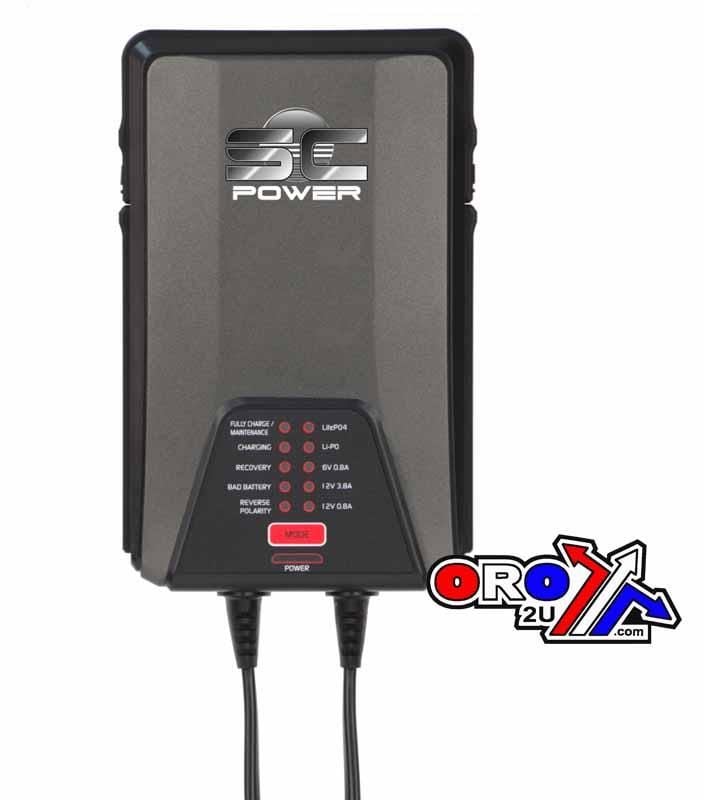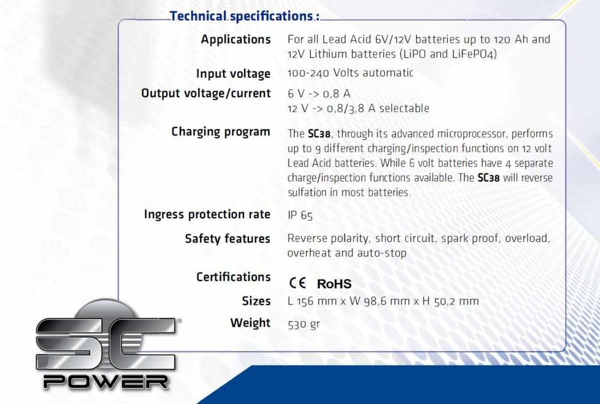 The SC38 is our universal Lead Acid/12V Lithium charger in the SC Power line-up and is suitable for small vehicles (motorcycles, scooters, lawn equipment, etc.), and for vehicles with battery capacities up to 120 Ah. This charger is fully automatic for 6 V and 12V Lead Acid batteries and for all 12V Lithium starting batteries (LiPO or LiFeP04). Additionally, this charger has the ability to reverse sulfation in most 12V lead acid batteries.