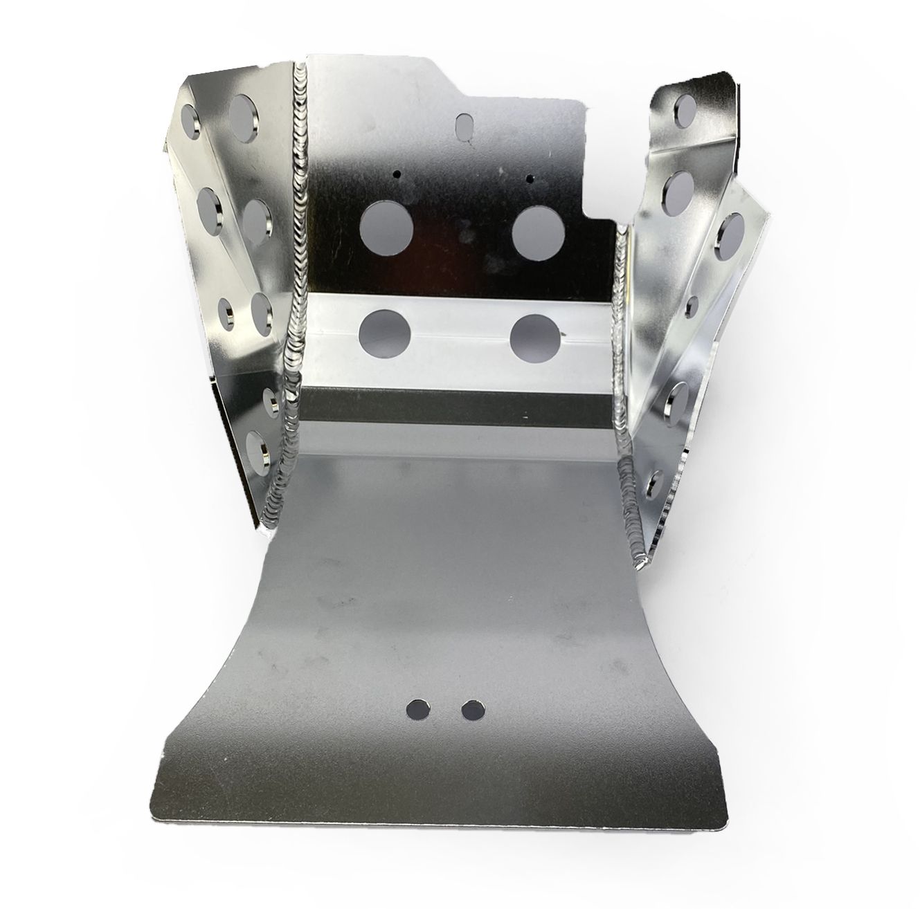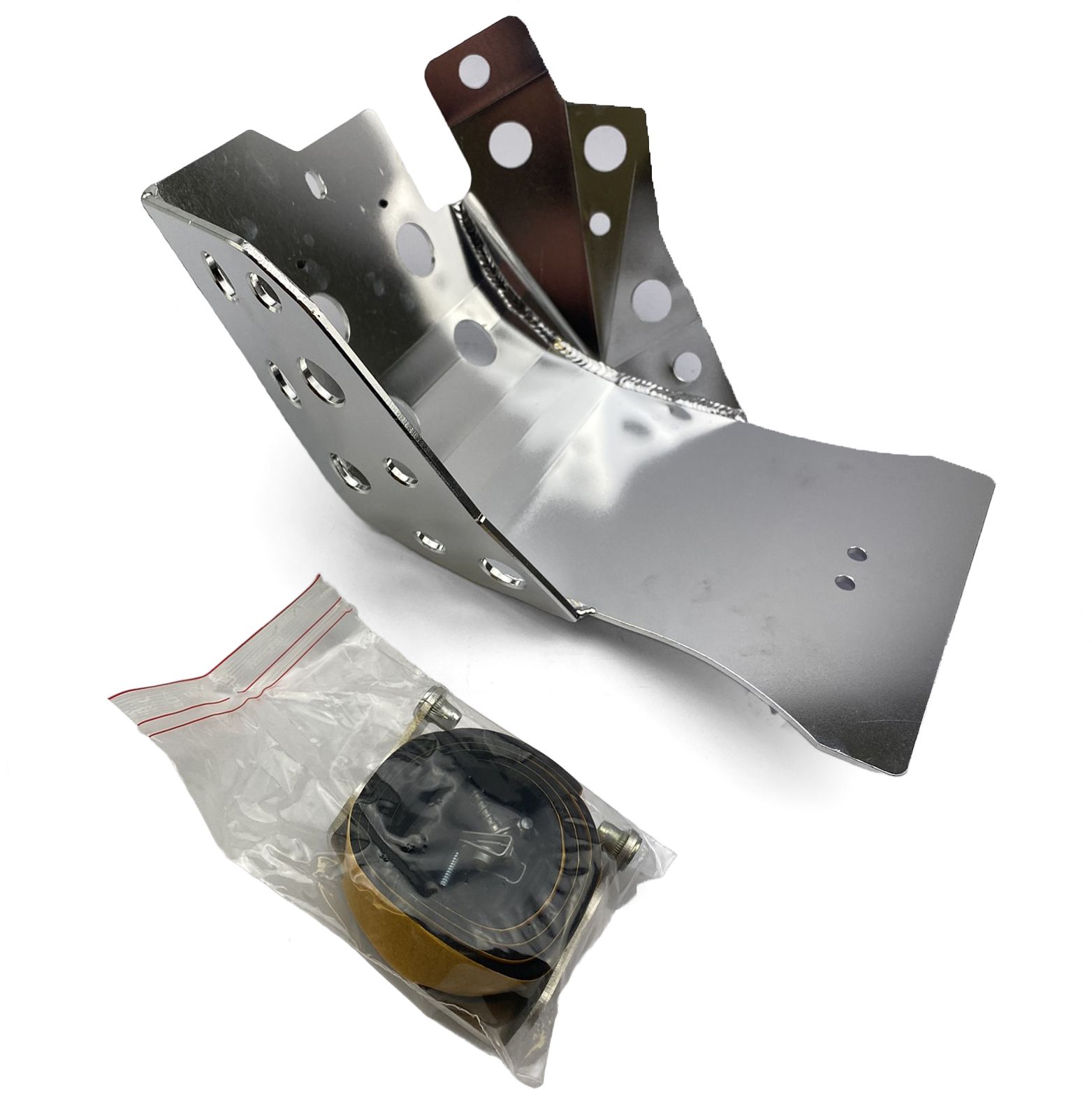 An anodized aluminium skid plate designed for KTM SX 125/150 models from 2016-2018, offering robust under body engine and manifold protection. Suitable for extreme conditions, it shields the engine and frame from ground impacts, especially on rocky surfaces. Constructed from durable yet lightweight aluminium, it features precision welding and reinforcement at critical points for enhanced durability. Integrated air slots ensure optimal cooling and dirt drainage. Delivered ready to install with all necessary mounting hardware included.
