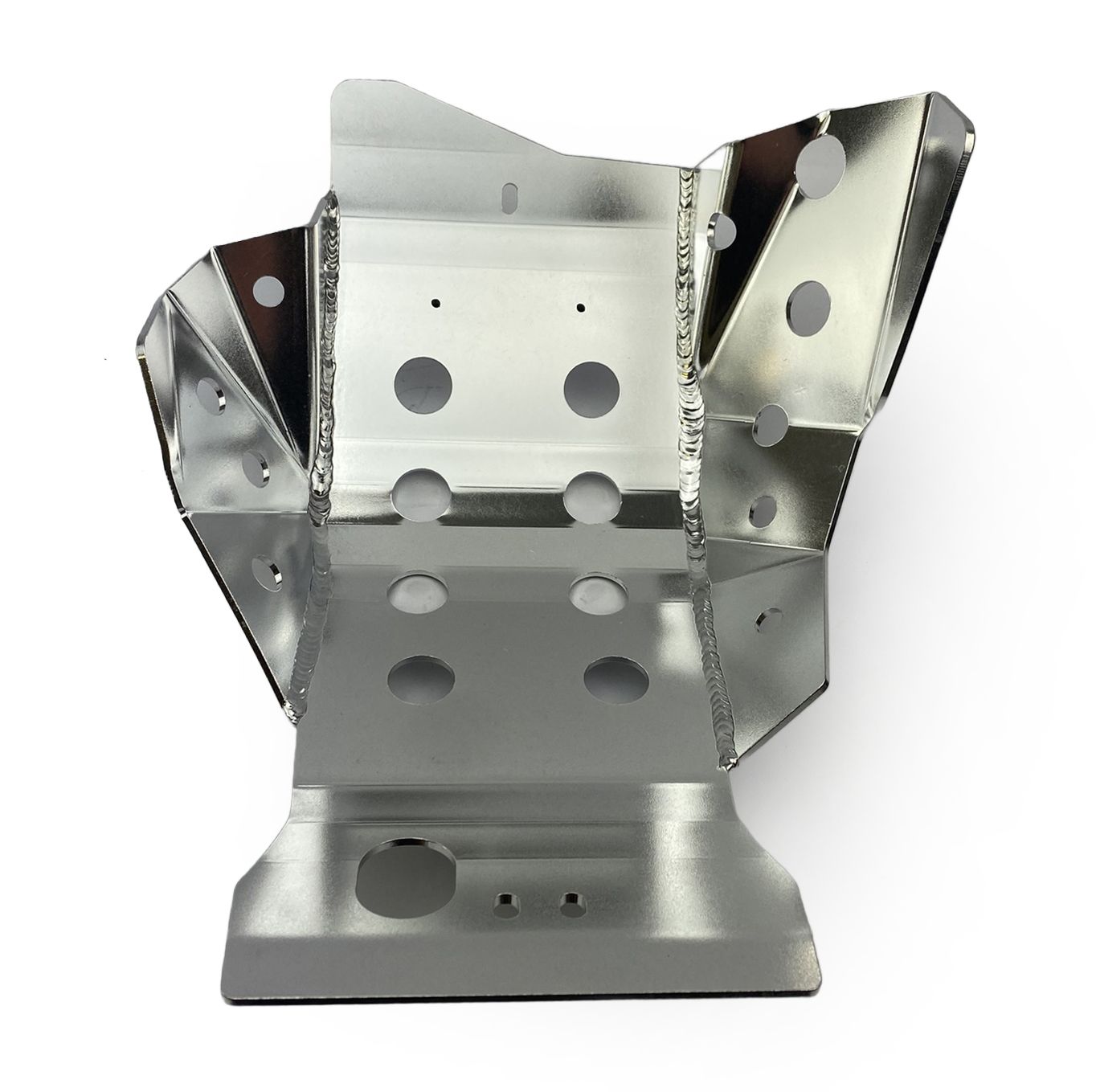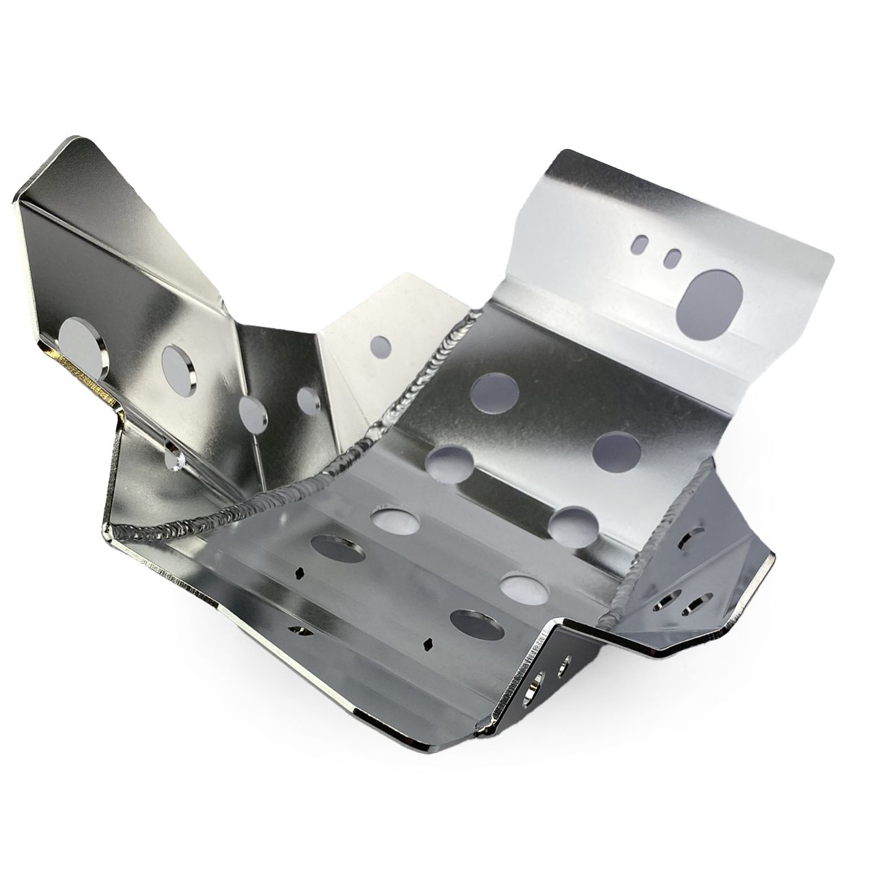 An anodized aluminium skid plate designed for KTM SX-F 250/350 models from 2016-2018, offering robust under body engine and manifold protection. Suitable for extreme conditions, it shields the engine and frame from ground impacts, especially on rocky surfaces. Constructed from durable yet lightweight aluminium, it features precision welding and reinforcement at critical points for enhanced durability. Integrated air slots ensure optimal cooling and dirt drainage. Delivered ready to install with all necessary mounting hardware included.
