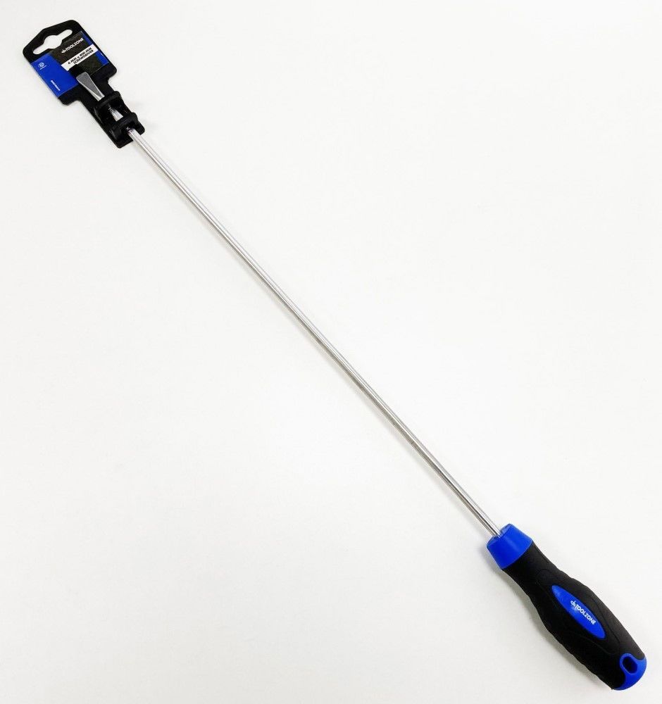 This screwdriver is equipped with a 400 mm long blade and a 6 mm slotted tip, suitable for accessing screws in deep or hard-to-reach areas. It is made with a chrome vanadium blade and features a black and blue comfort grip handle.