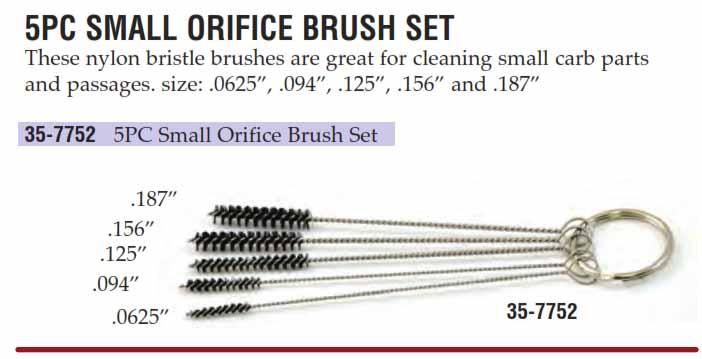 These nylon bristle brushes are great for cleaning small carb parts and passages. size: .0625”, .094”, .125”, .156” and .187”