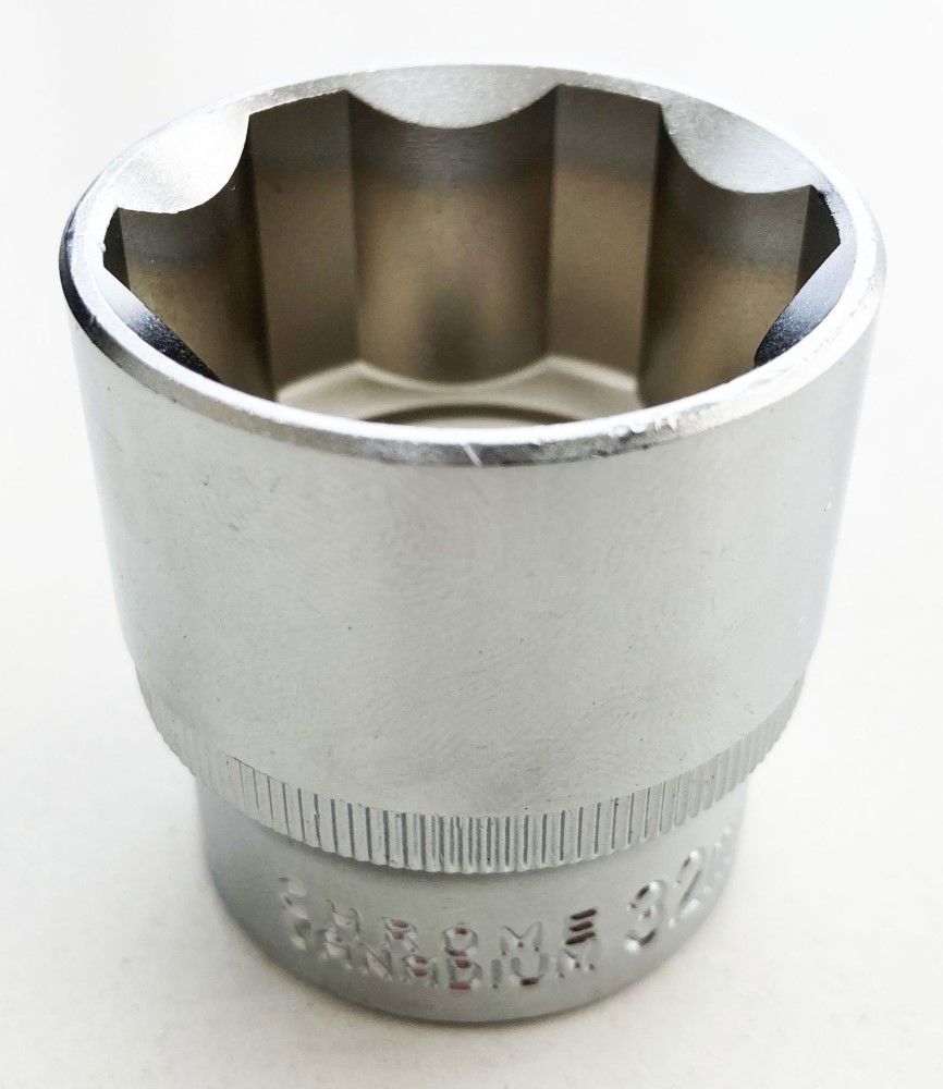 This 1/2″ drive 32 mm socket is constructed from chrome vanadium steel with a satin finish. It features a single hex design and has a net weight of 180 g. The package dimensions are 5 x 11 x 4 cm.