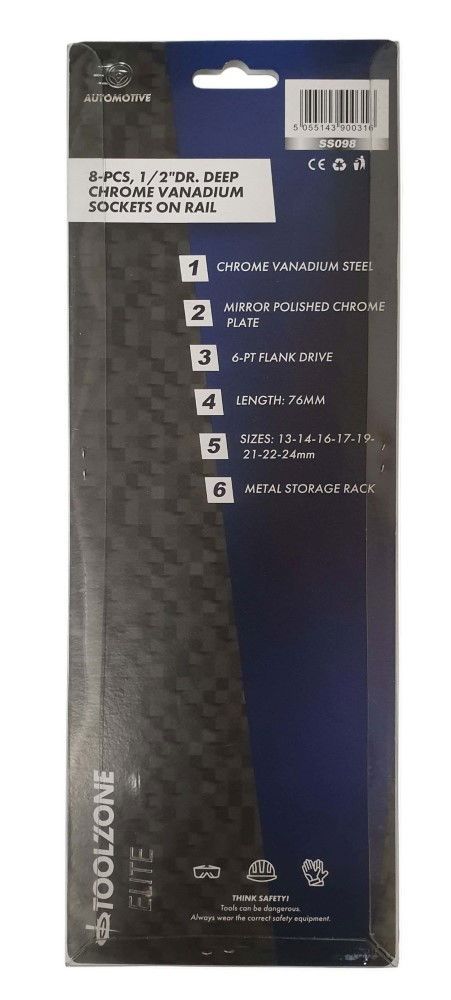This 8-piece deep socket set is designed for 1/2″ drive applications and includes socket sizes from 13 mm to 24 mm. Each socket is crafted from chrome vanadium steel with a polished finish and features a single hex, 6-sided design. The sockets have a length of 76 mm and are supplied on a mountable storage rail. The package dimensions are 12.5 x 35 x 5 cm.