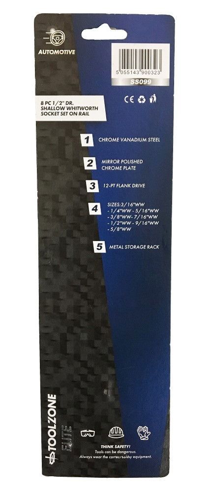 This 8-piece Whitworth shallow socket set is intended for 1/2″ drive applications, with sizes ranging from 3/16 WW to 5/8 WW. The sockets are constructed from chrome vanadium steel with a polished finish and are supplied on a mountable storage rail. The package dimensions are 10 x 32 x 5 cm.