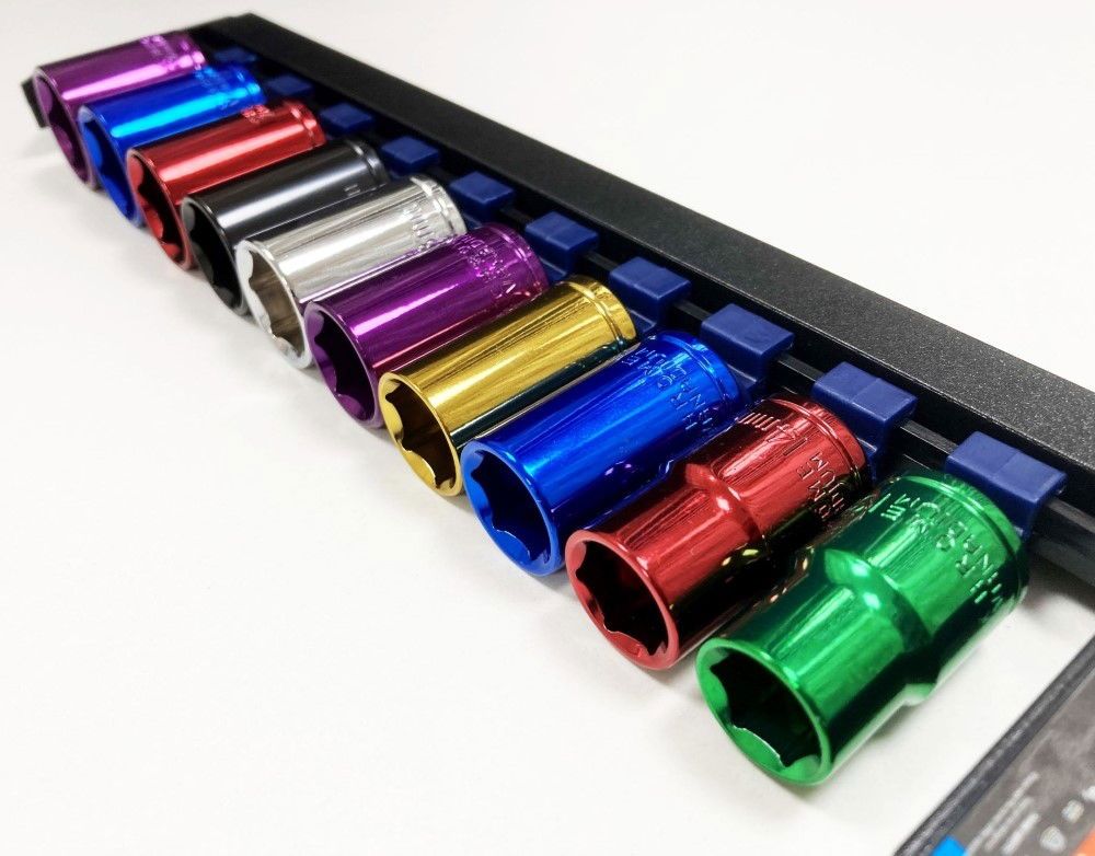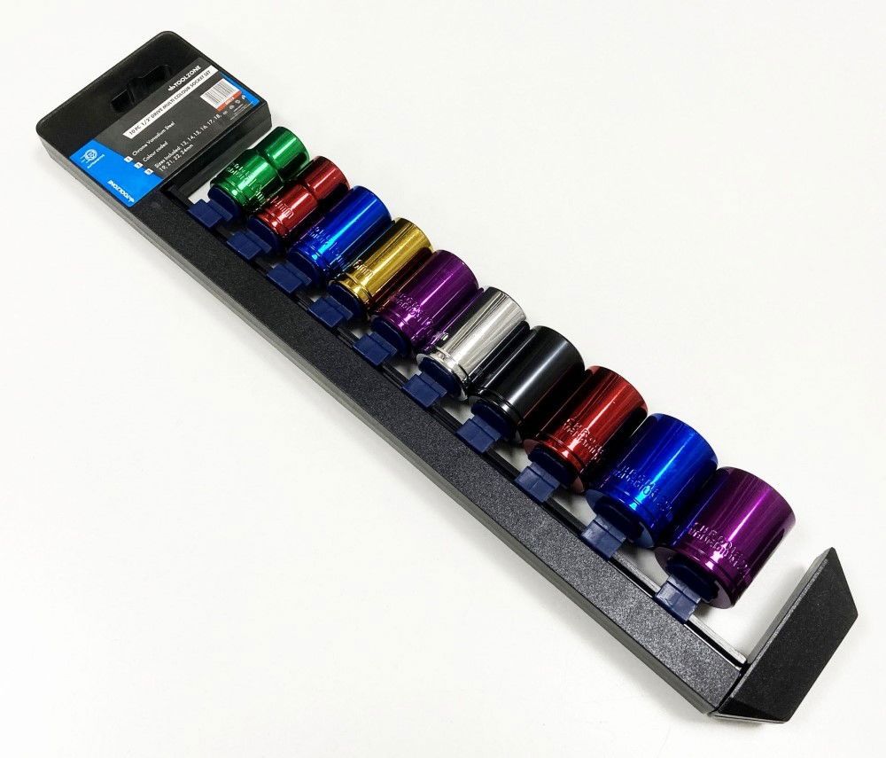 This 10-piece set of 1/2″ drive metric standard sockets is manufactured from chrome vanadium and features highly visible, color-coded sockets for straightforward size identification. The set includes socket sizes from 13 mm to 24 mm and comes in packaging measuring 8 x 33 x 3 cm.