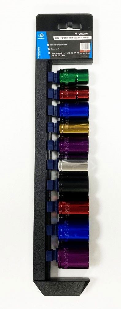 SOCKET SET 10 PIECES 1/2″ DRIVE MM CRV COLOUR CODED 13mm-24mm – TOOLZONE KDPSS313