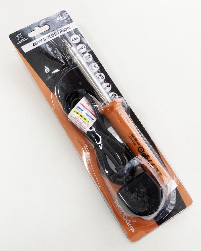 This 60-watt soldering iron is intended for general electrical work. It is equipped with a screwdriver type tip, a UK BS plug, and a 1-meter cable. The unit operates at 230V/50Hz and holds CE, GS, TUV, and RoHS approvals.
