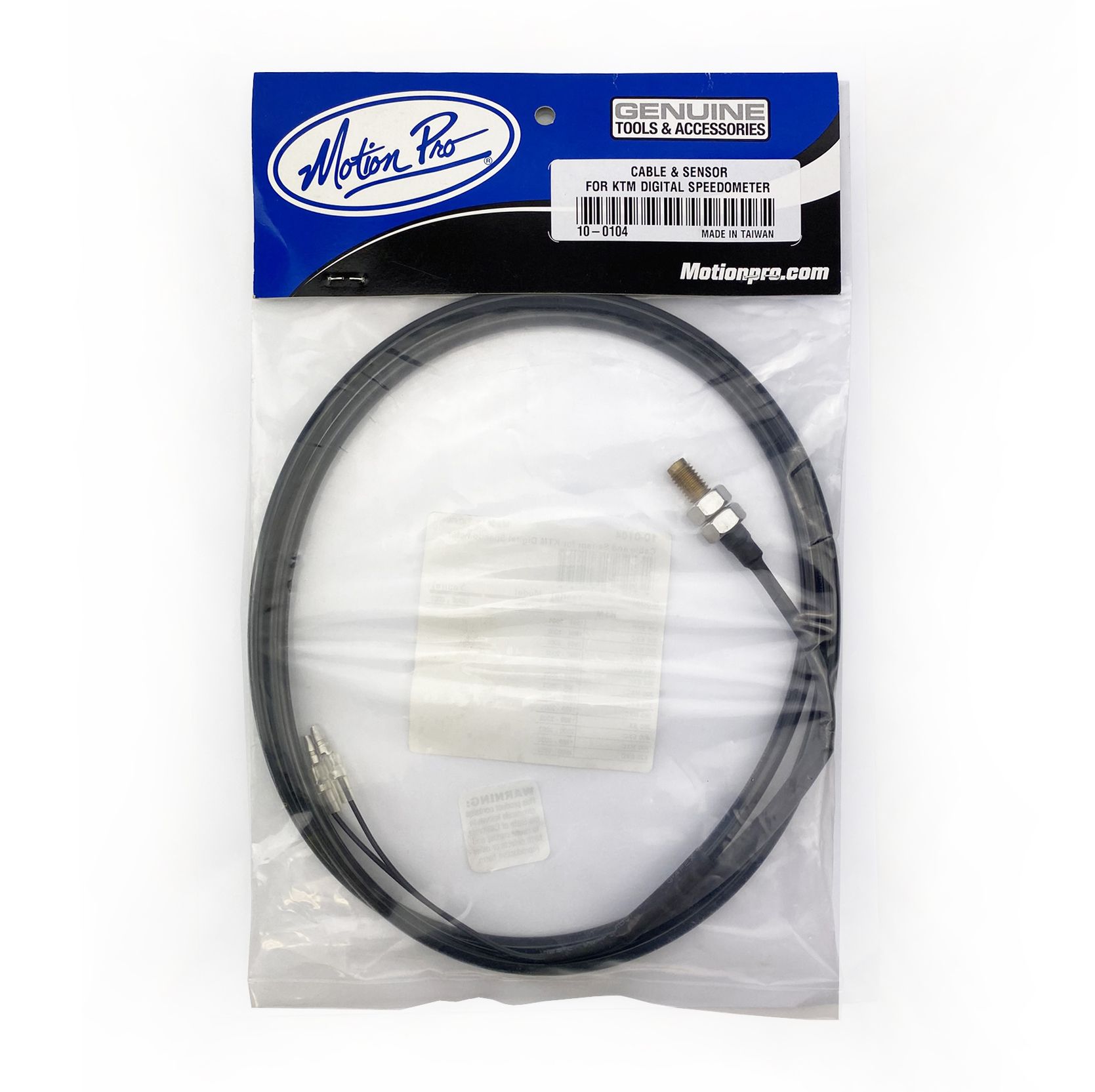 Durable Motion Pro digital speedometer cable and sensor, designed as a direct replacement for KTM models from 1998 to 2002. Ensures accurate speedometer functionality and straightforward installation without the need for special tools.