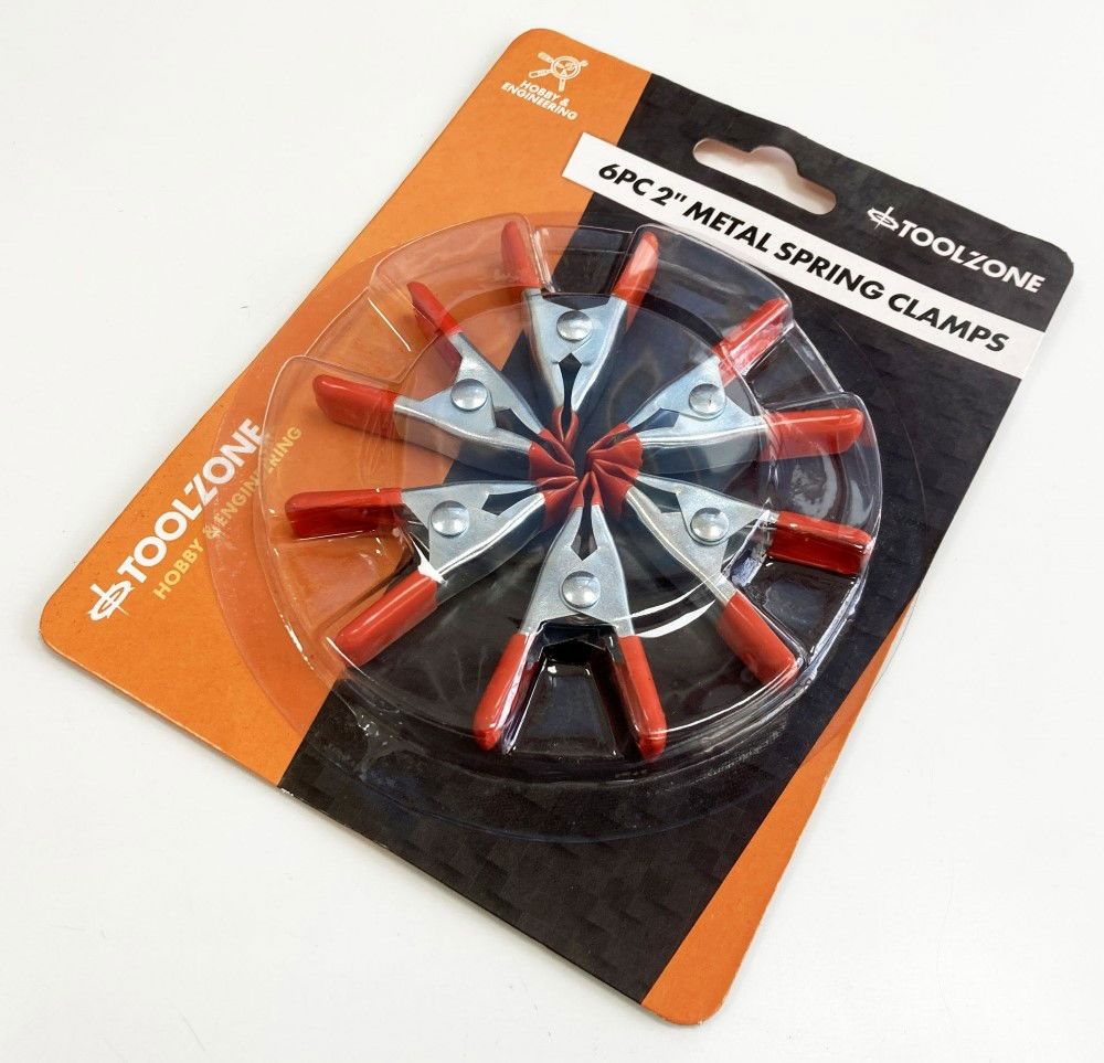 This set contains six 2-inch metal spring clamps, each fitted with PVC-coated tips and handles. The clamps deliver strong clamping force and feature jaws that open to 25 mm (1″).