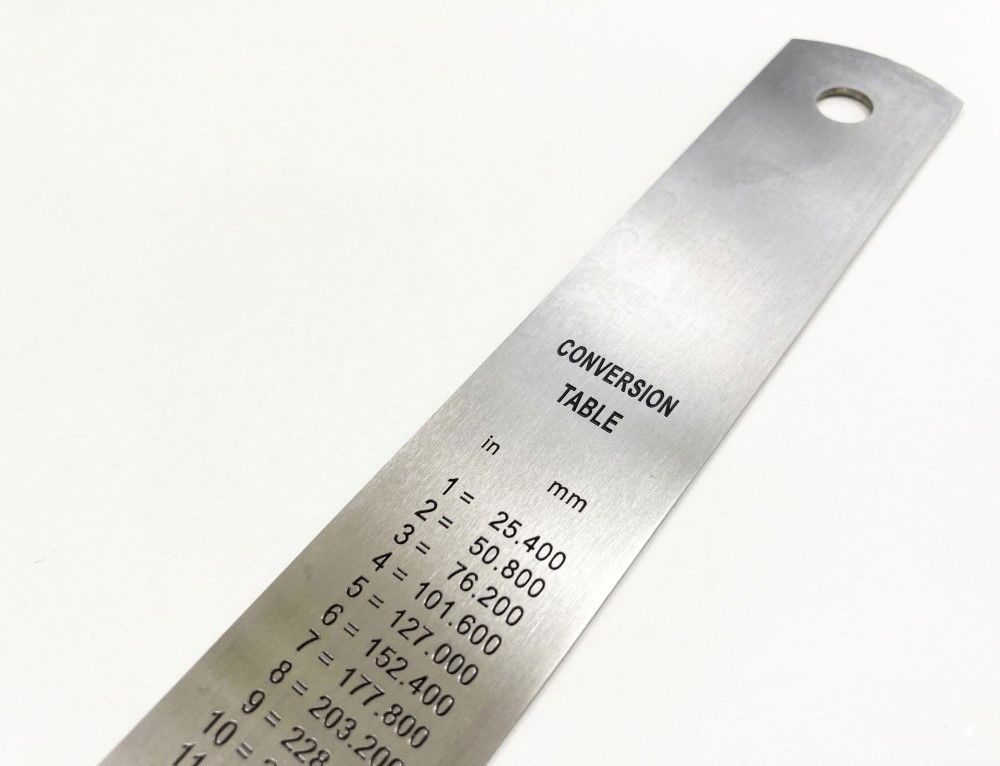 This 24-inch stainless steel ruler is constructed from rust-resistant material and features both metric and imperial measurements with permanent black-filled graduations. The ruler has a 1.2mm blade thickness, a width of 30mm, and includes a conversion chart on the reverse side.