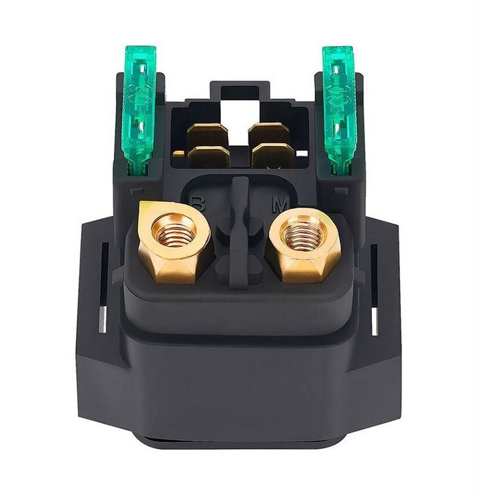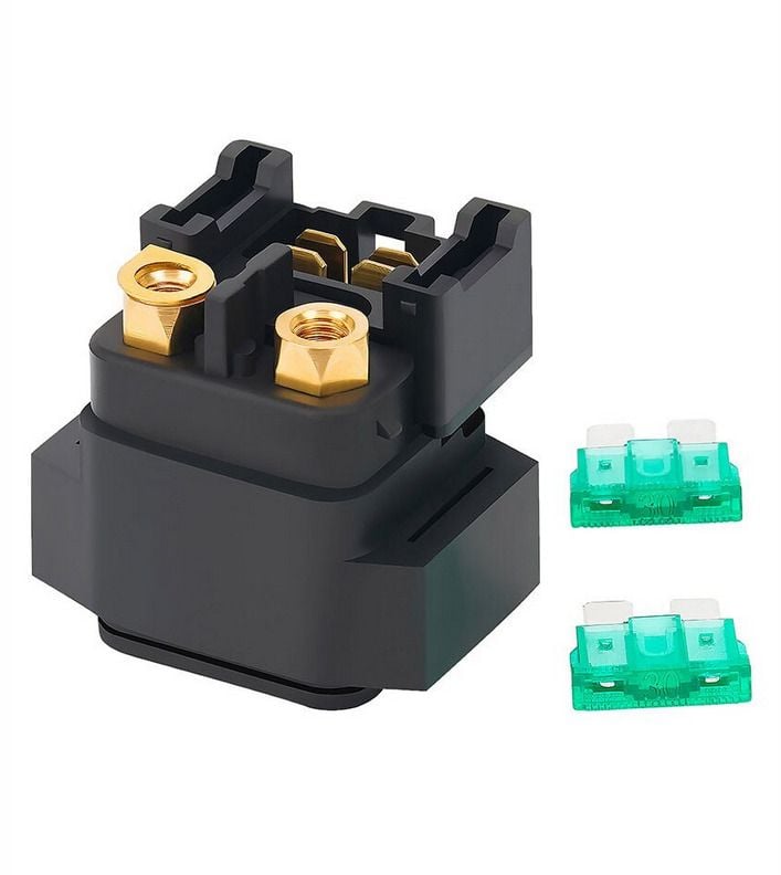 Starter relay solenoid for Yamaha models, designed as a direct OEM replacement. Manufactured to meet or exceed OEM quality standards and tested for 100% reliability. Built to handle increased power loads and includes a rubber mounting bracket. May come with either a red or green fuse.