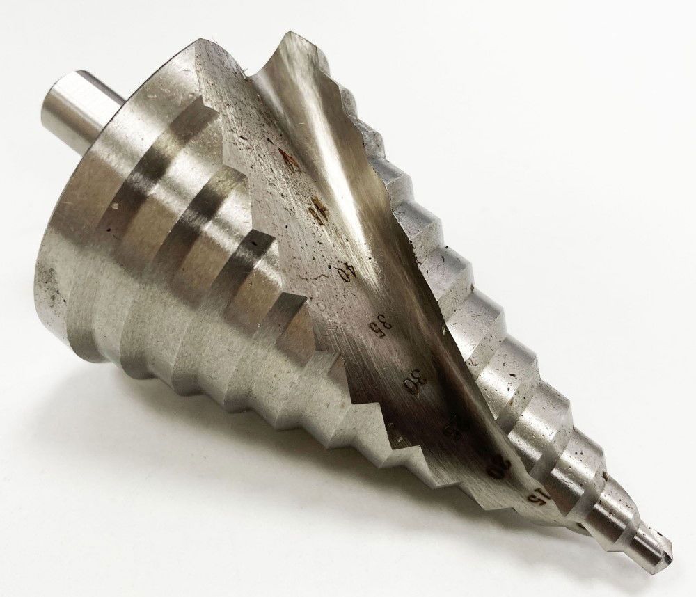 This step drill is constructed from fully ground HSS 4341 steel and features 12 incremental steps ranging from 6 mm to 60 mm in 5 mm increments. It is designed for use with steel and sheet materials.