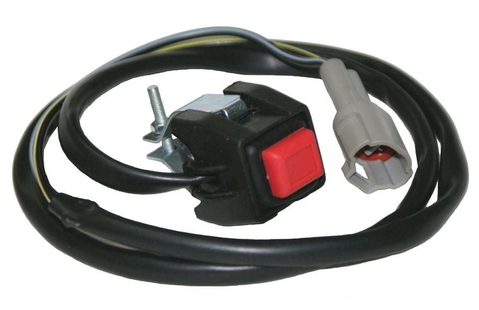 Kill Switch. Comes complete with wires (76cm) and clip in 2 pin connecter. Normal Position: Open Circuit. Button pushed. Will mount to any 7/8″ handlebars.