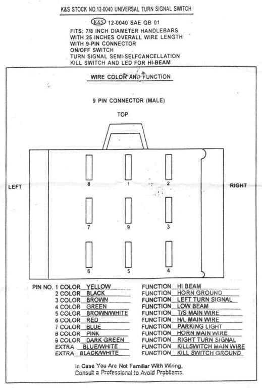 black-horn ground brown-left signal green-low beam brownwhite-turnsignal main(flasher) red-main power blue-parking light pink-horn darkgreen-right signal bluewhite-kill switch main