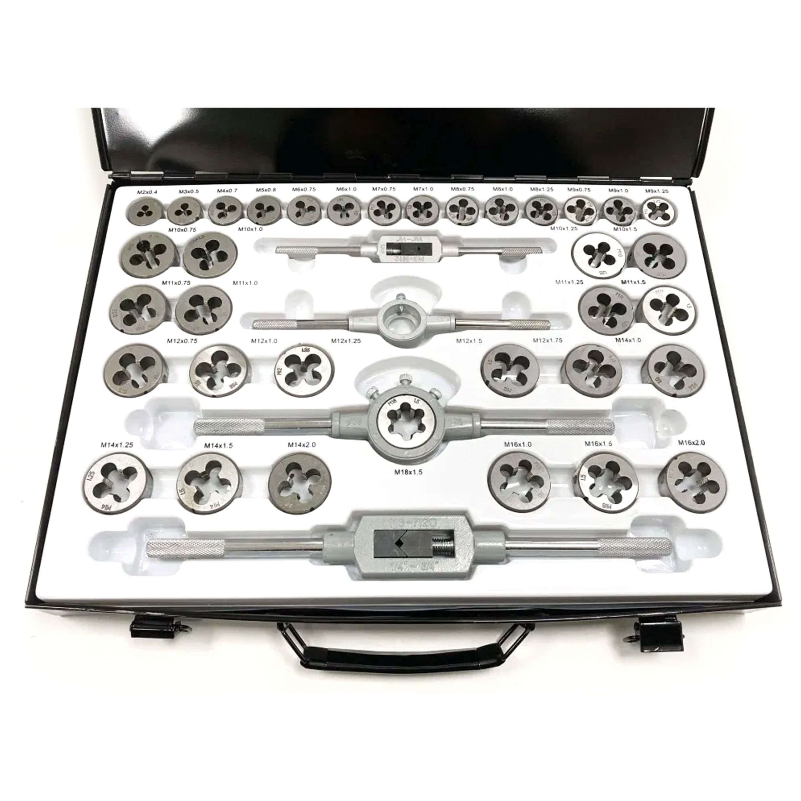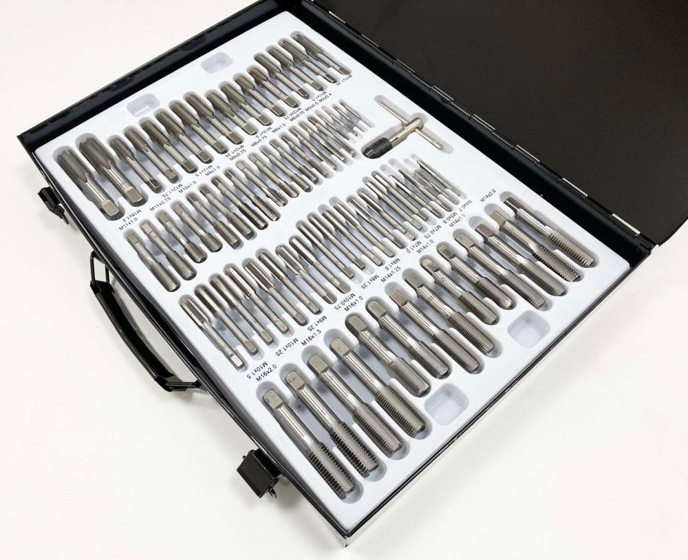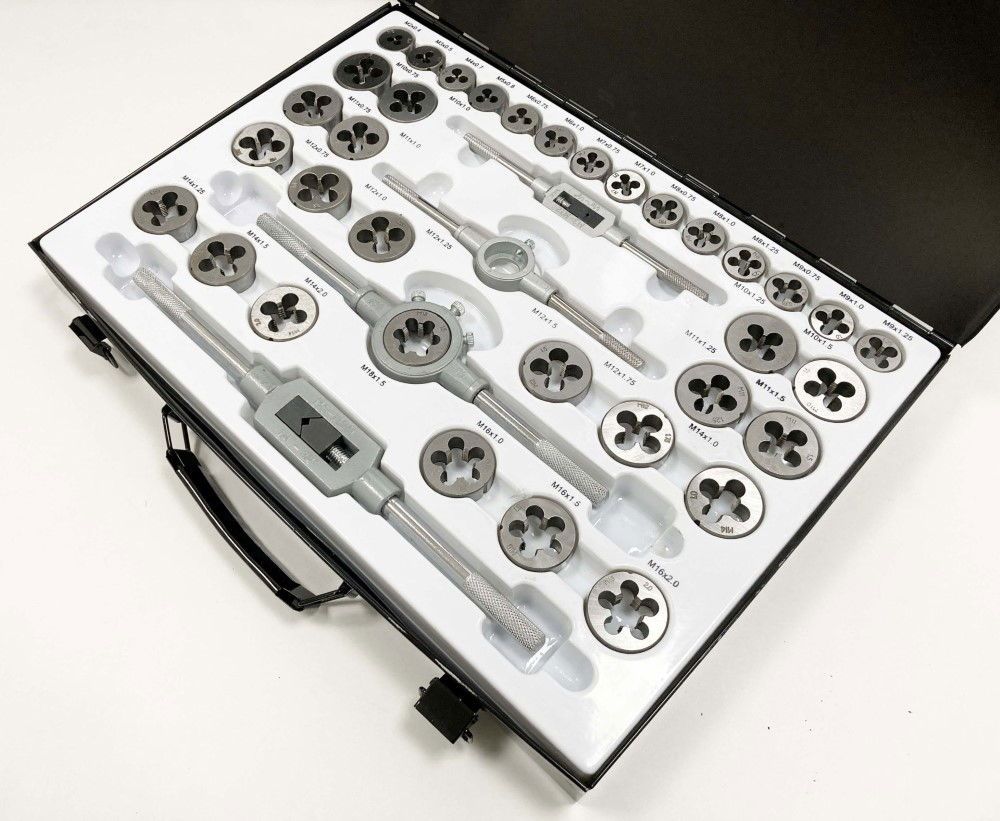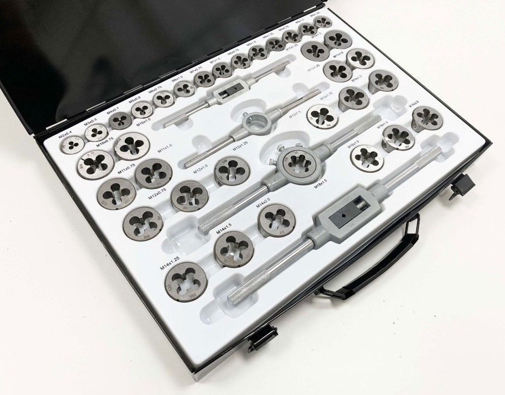 - Includes taper and plug taps and dies in sizes: 2×0.4, 3×0.5, 4×0.7, 5×0.8, 6 & 7×0.75-1.0, 8 & 9×0.75-1.25, 10 & 11×0.75-1.5, 12×0.75-1.75, 14×1.0-2.0, 16×1.0-2.0, 18×1.5