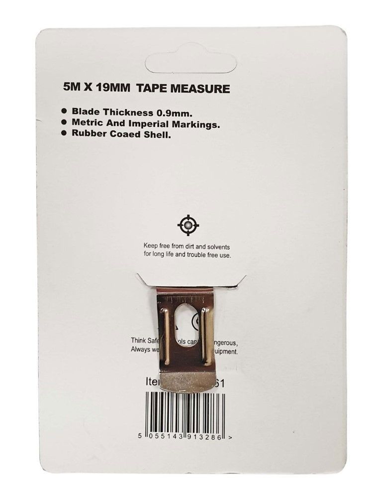 This 5-metre by 19mm tape measure features both metric and imperial markings. It is equipped with a 0.9mm thick blade and housed in a polypropylene shell with a rubber grip cover.