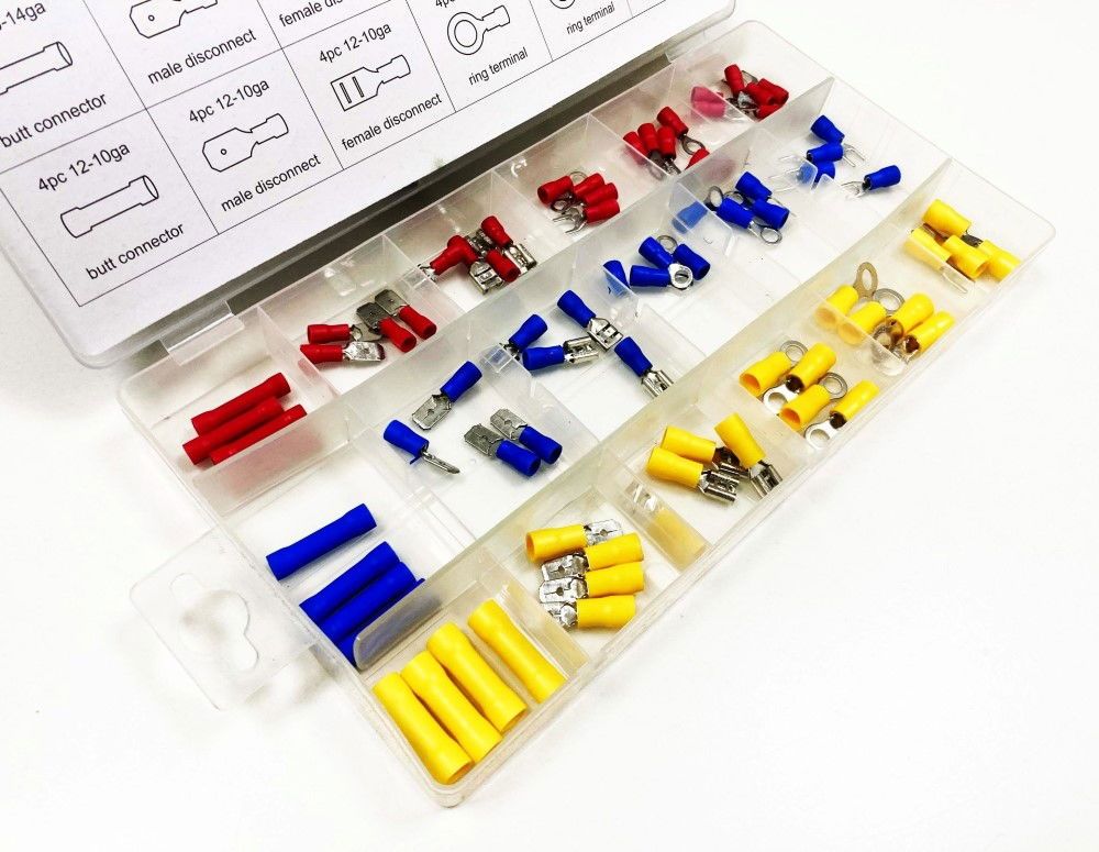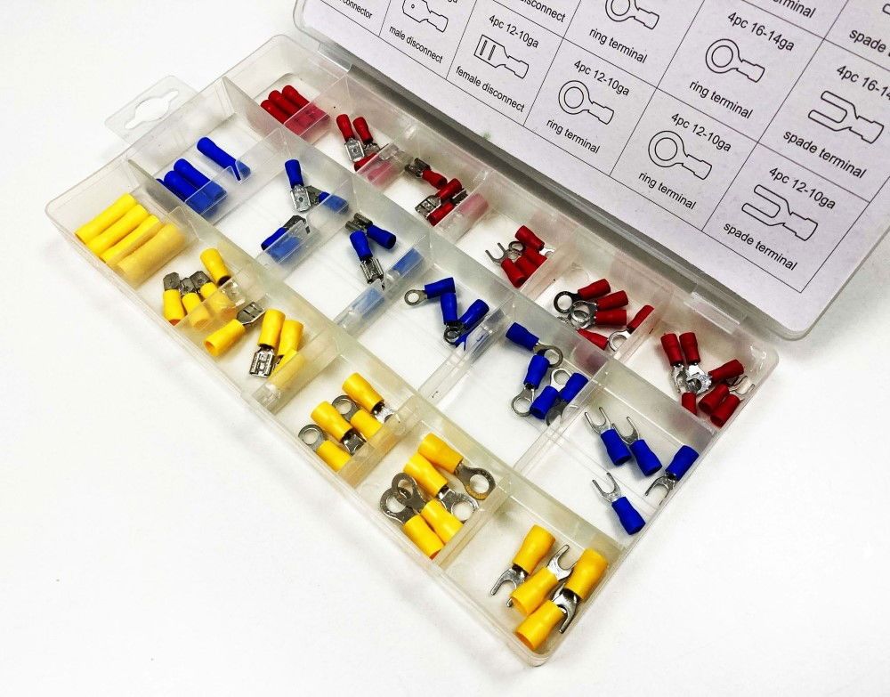 This 76-piece terminal assortment box contains a wide variety of terminals, including butt connectors, male disconnectors, and female disconnectors. The set covers sizes for 12-10GA, 16-14GA, and 22-18GA wires, with multiple types including ring and spade terminals.