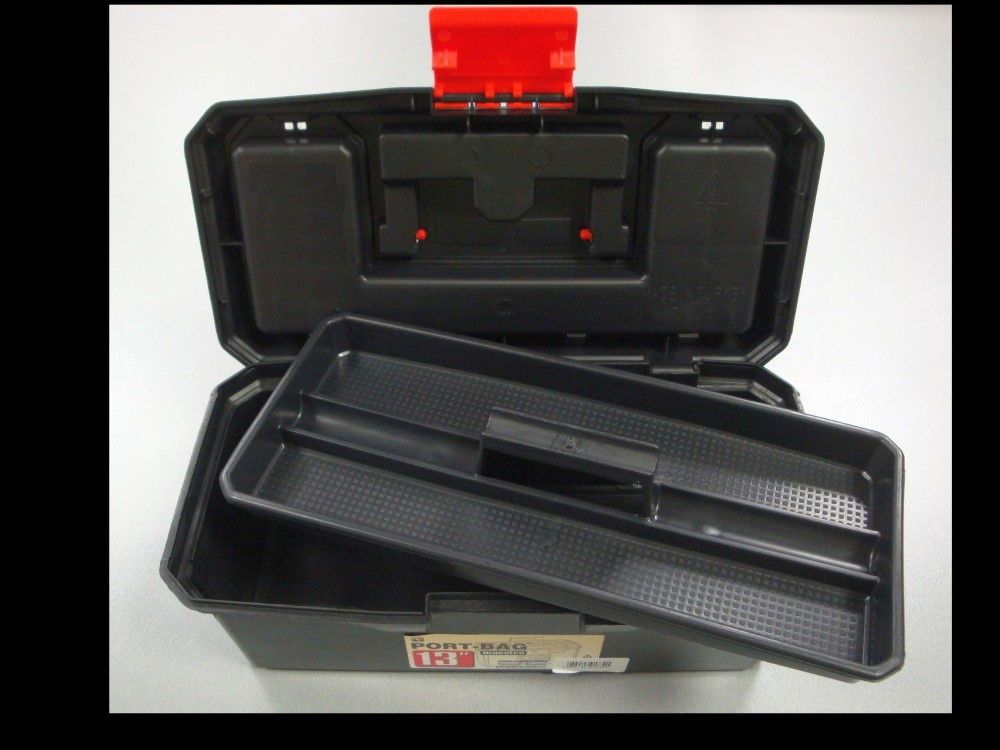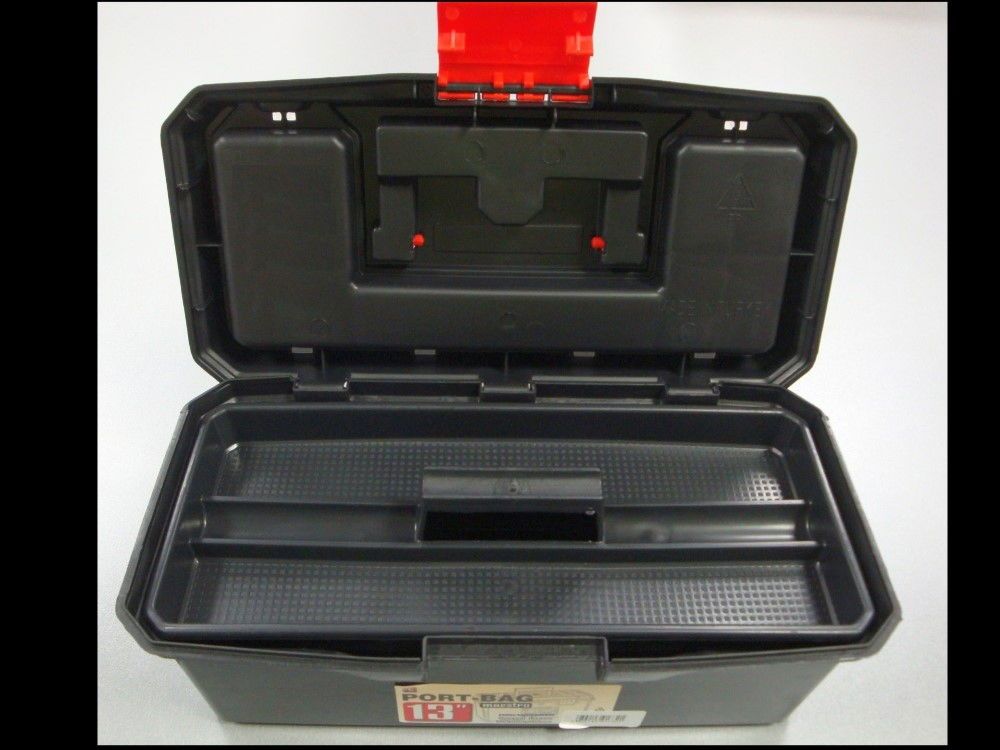 This 13″ Maestro toolbox is black and red in color and includes clear fixed organiser sections in the lid. It is equipped with a plastic carry tray inside and a folding main handle for easier storage. Package dimensions are 32 x 13 x 16 cm.