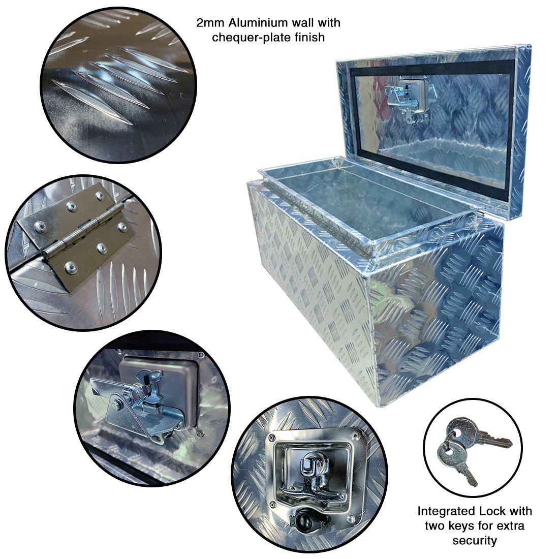 This 60L aluminium chequer plate trailer storage box provides a durable and weather-resistant solution for storing tools and equipment on trailers. Designed for underbody or hitch mounting, it features a secure locking mechanism, folding handle, and corrosion-resistant construction suitable for various trailer and commercial applications.