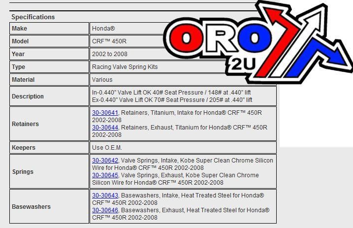 VALVE SPRING SET CRF450 02-08, KIBBLEWHITE 30-30640 RACING, LIGHTWEIGHT