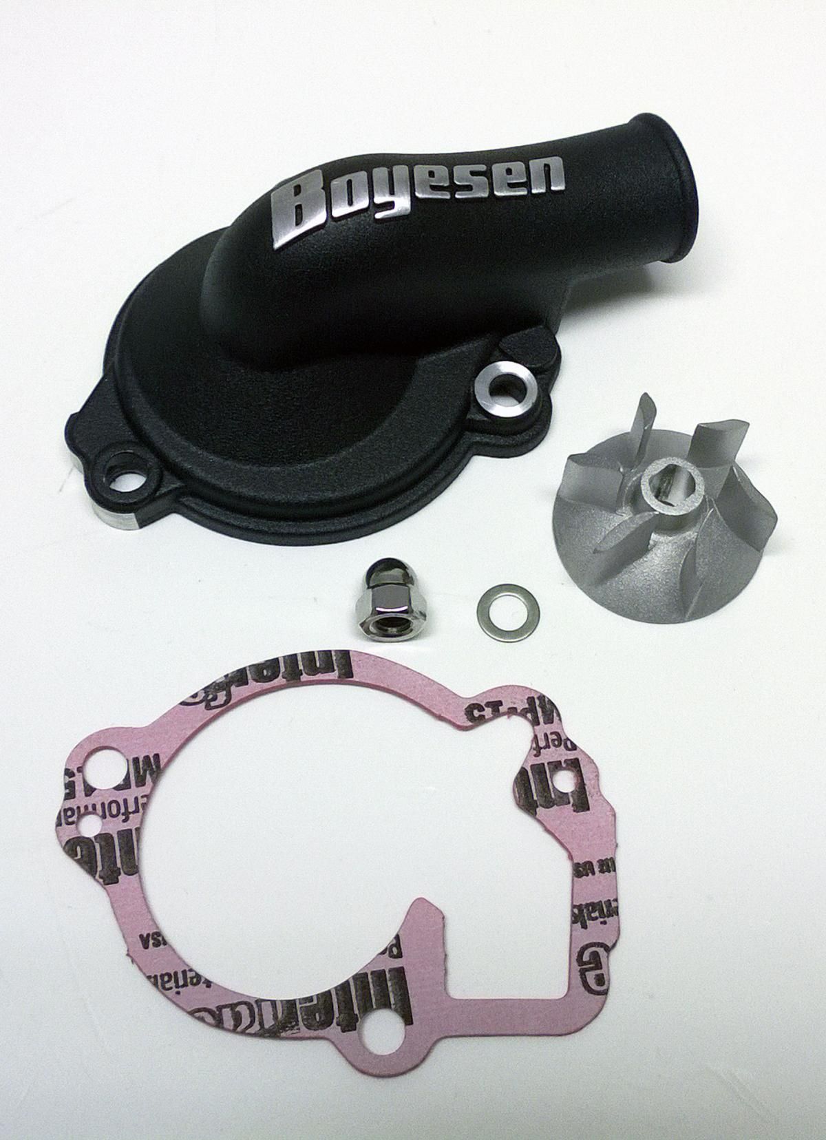 The Boyesen SuperCooler water pump kit is an aluminum investment cast water pump cover and impeller combo; specifically designed to enhance the performance of your engines cooling system.
