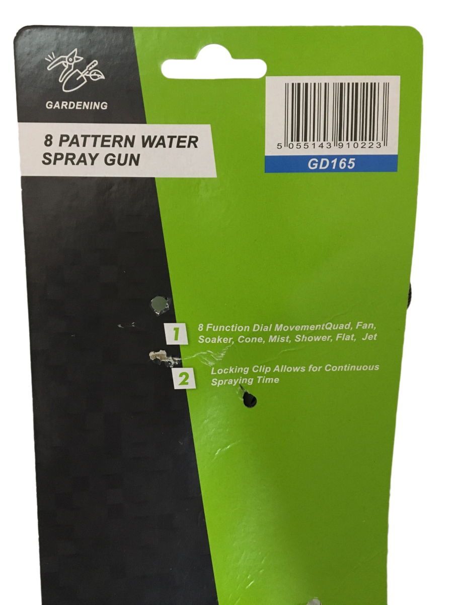This water spray gun features eight different spray patterns, each clearly marked on the nozzle for straightforward selection. It is equipped with a comfortable cushion rubber grip and includes a locking clip designed for continuous use to help reduce hand fatigue.