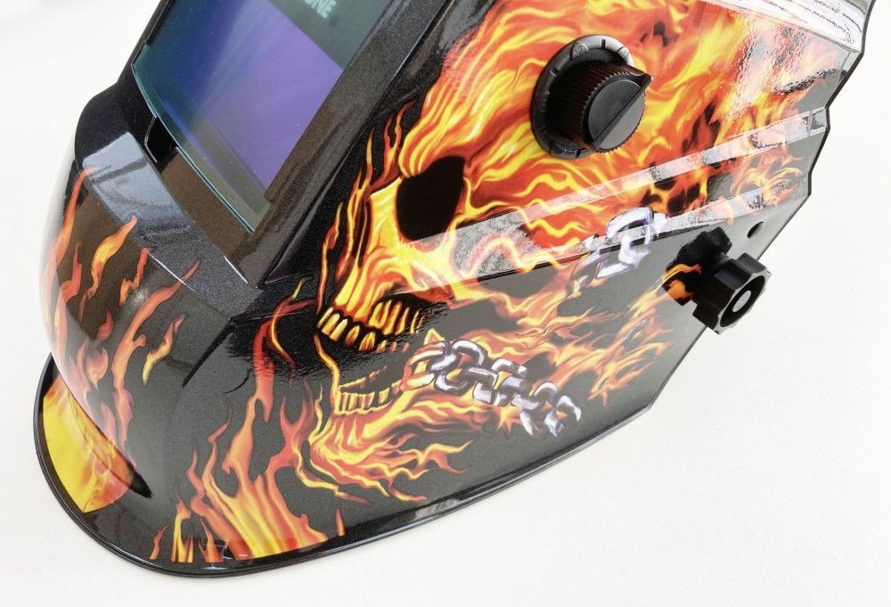 This welding helmet features a striking flame design and provides automatic variable control with a dedicated grinding mode. It is equipped with a large filter, UV and infrared protection, and offers various operational settings for precision and safety.