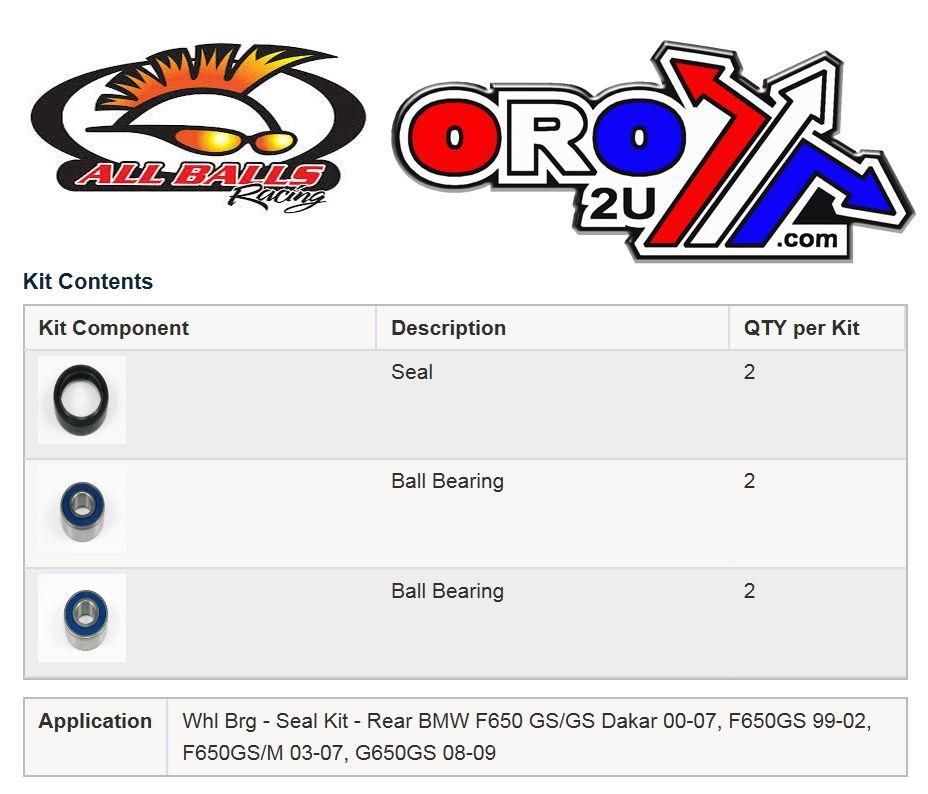 WHEEL BEARING KIT REAR 99-15 BMW F/G 650, ALLBALLS 25-1646 ROAD