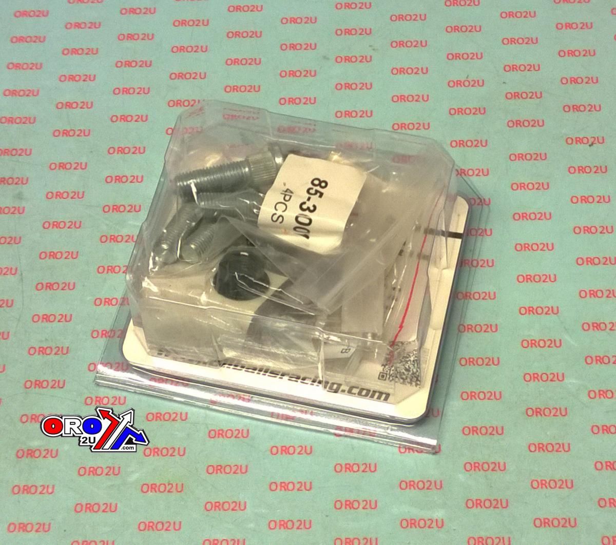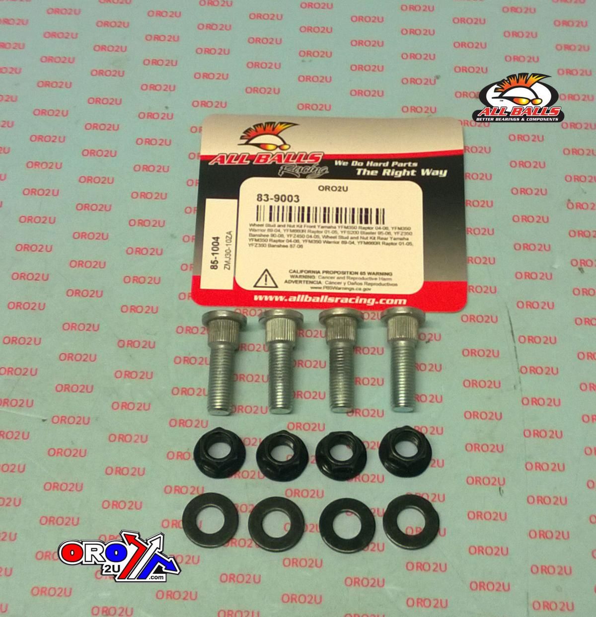 This wheel stud and nut kit (ALLBALLS 85-1004) is designed for both front and rear wheel applications on various Yamaha sport ATV models. It includes four wheel studs, four nuts, and four washers, providing a complete solution for reliable wheel attachment on Raptor, Warrior, Blaster, Banshee, and YFZ models.
