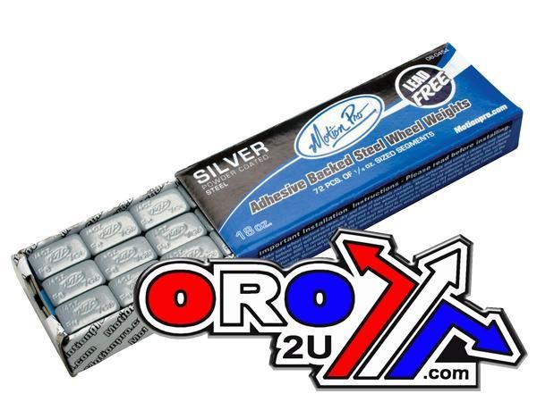 The Motion Pro Wheel Weights are adhesive-backed steel weights designed for precise wheel balancing on motorcycles. Each weight segment weighs 7 grams (1/4 oz) and features a shiny nickel-plated finish, making them ideal for chrome wheels. The weights are lead-free and come in a box containing 360 segments, arranged in 30 strips with 12 segments per strip. The adhesive backing is suitable for both spoked and cast wheels.
