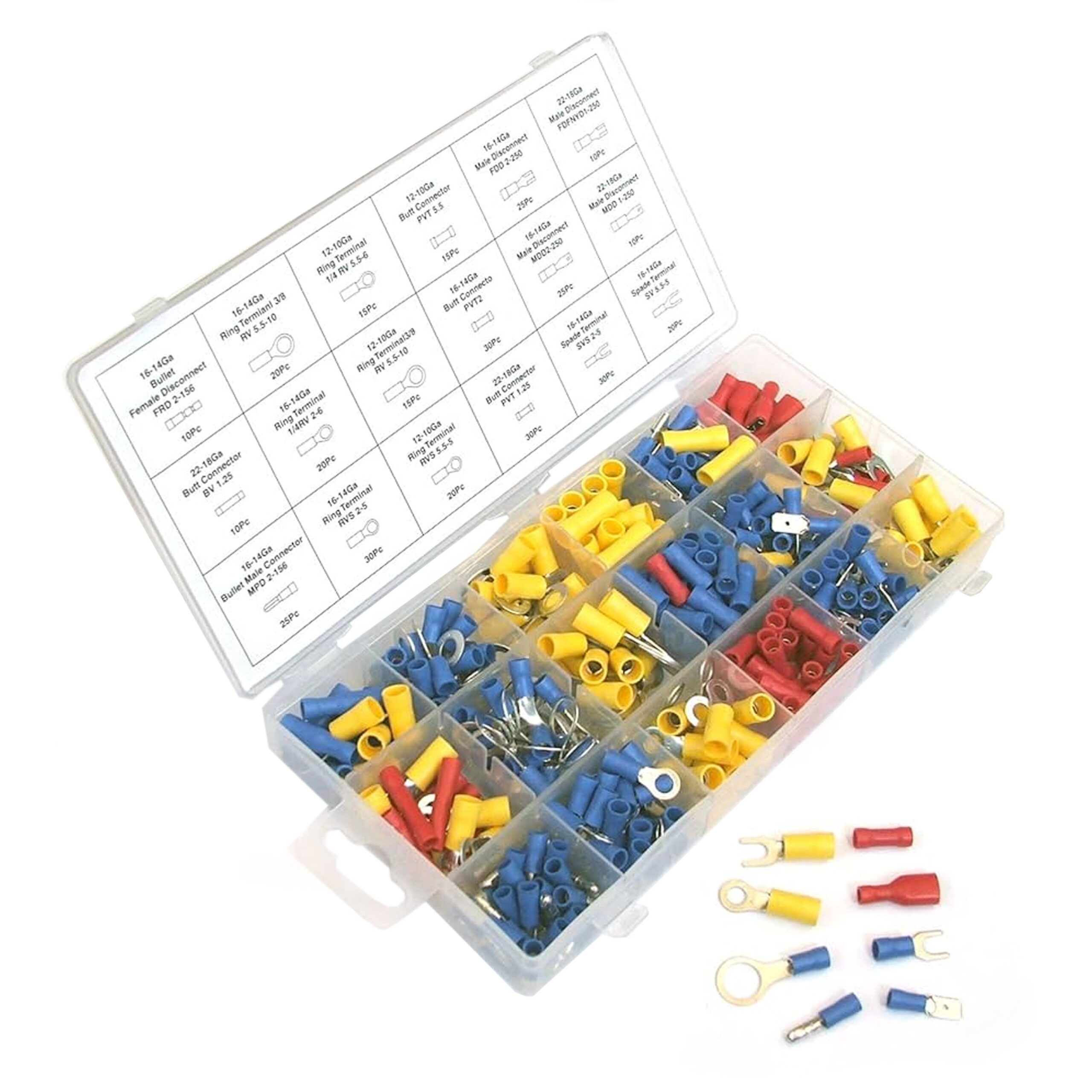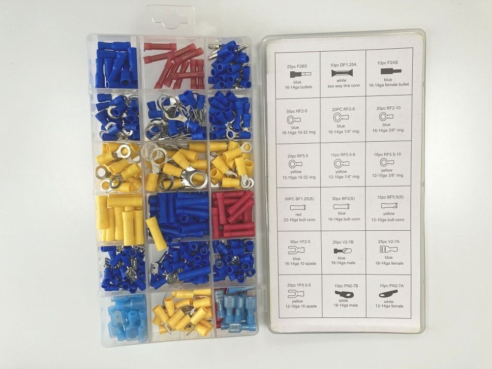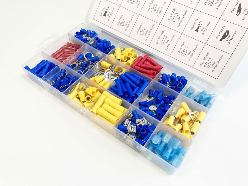 - Assortment includes male and female disconnects, bullet connectors, and ring terminals